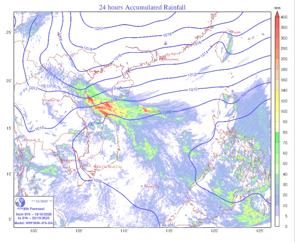 Theo đó dự báo: Do ảnh hưởng của không khí lạnh kết hợp với dải hội tụ nhiệt đới có trục đi qua Trung Trung Bộ nên ngày và đêm nay (20/10), ở các tỉnh Hà Tĩnh, Quảng Bình có mưa to đến rất to với lượng mưa từ 50-100mm, có nơi trên 100mm; ở Nghệ An từ 10-30mm, riêng phía Nam có nơi trên 40mm.