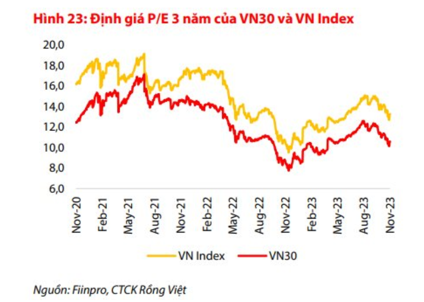 Cụ thể, P/E của VN-Index hiện đạt 13.3x trong khi của VN30 chỉ 10.6x (lợi nhuận sau thuế 12 tháng trong hệ số P/E đã phản ánh kết quả kinh doanh quý 3 tại ngày 03/11/2023), hàm ý lợi suất 1 năm đối với VN-Index và VN30 lần lượt là 7.5% và 9.4%.