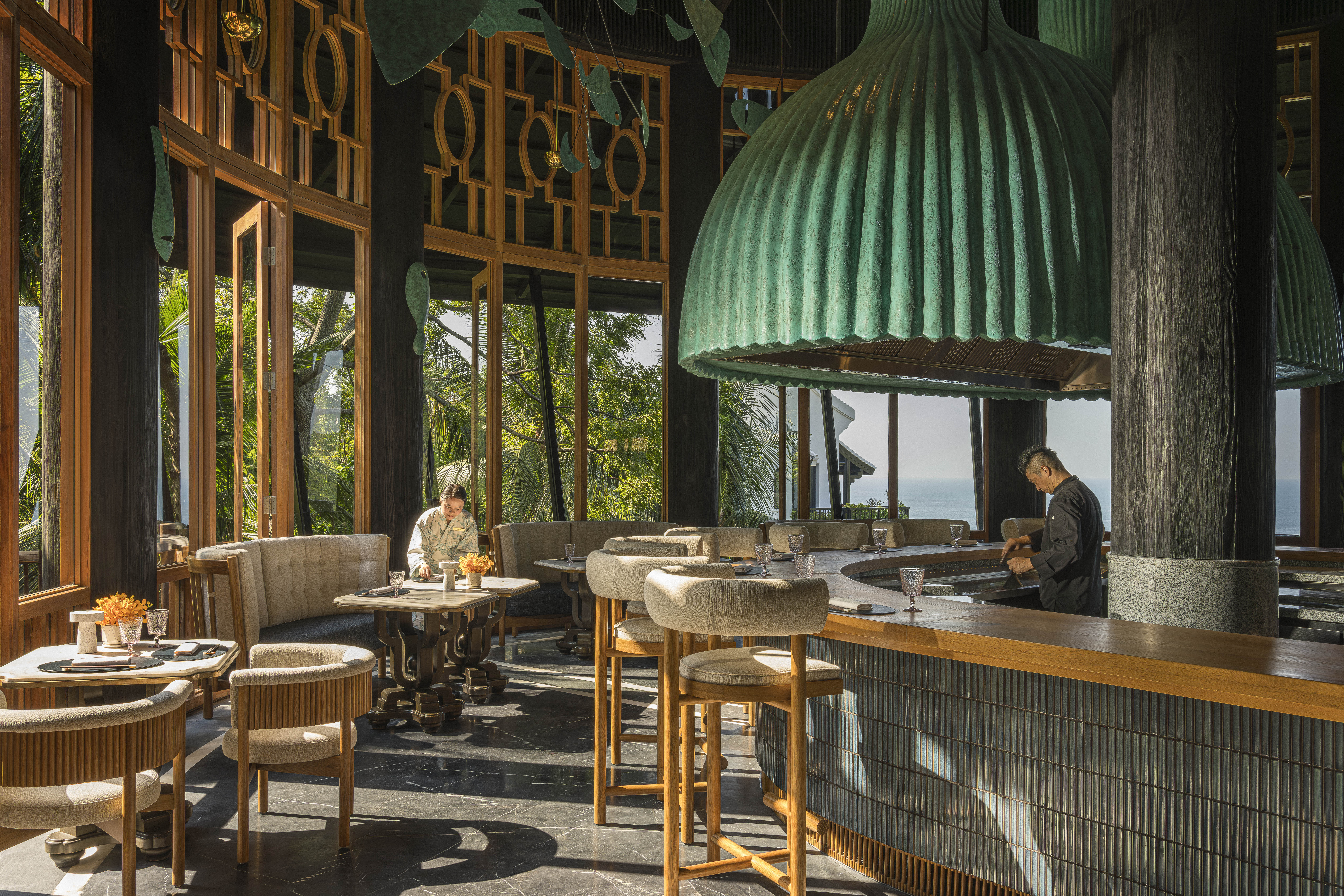 Không gian tại Tingara được thiết kế tinh tế để đáp ứng mọi nhu cầu của thực khách. Khu vực trung tâm nổi bật với quầy ẩm thực tròn bao quanh bếp Teppanyaki, nơi thực khách có thể tận mắt chứng kiến các đầu bếp tài hoa trình diễn nghệ thuật chế biến ngay trước mặt. Ngoài khu quầy trung tâm, Tingara còn bố trí các bàn ăn riêng biệt, được đặt khéo léo bên cửa kính lớn với tầm nhìn bao quát ra khung cảnh thiên nhiên Sơn Trà.