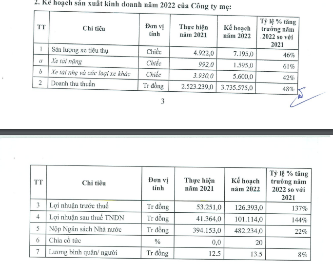 Theo tờ trình dự kiến trình cổ đông, TMT đặt kế hoạch sản lượng xe tiêu thụ đạt 7,195 chiếc, tăng 46% so với năm 2021. Trong đó, xe tải nặng đạt 1,595 chiếc, tăng 61% và xe tải nhẹ và các loại xe khác đạt 5,600 chiếc, tăng 42%.