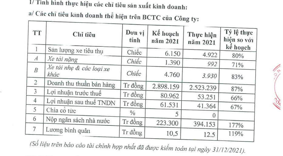 Về kết quả thực hiện các nhiệm vụ đề ra trong năm 2021, công ty ghi nhận đã tiêu thụ được tổng cộng 4.922 chiếc xe, tương ứng 80% kế hoạch đề ra. Trong đó có 992 chiếc xe tải nặng (71% kế hoạch) và 3.930 chiếc xe tải nhẹ và các loại xe khác (83% kế hoạch).