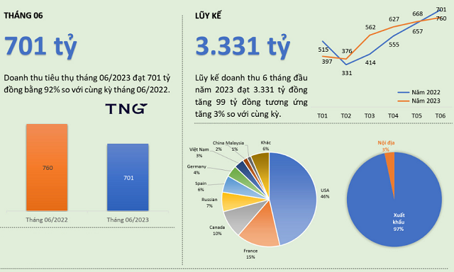 Lũy kế 6 tháng đầu năm, doanh thu TNG đạt 3,331 tỷ đồng, tăng 99 tỷ đồng, tương ứng tăng 3% so với cùng kỳ. Doanh thu xuất khẩu tiếp tục giữ chủ lực chiếm 97% tổng doanh thu. Trong đó, Mỹ, Pháp và Canada là 3 thị trường riêng lẻ lớn nhất của công ty này, lần lượt chiếm 46%, 15% và 10% thị phần. Riêng nội địa chỉ chiếm 3%.