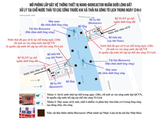 Nhóm 1: Hệ thống Nano-Bioreactor xử lý nước thải tại chỗ trong ngày (24h), rồi mới xả vào sông nước đạt QCVN, là nguồn cấp nước bổ cập tại chỗ cho sông Tô Lịch.