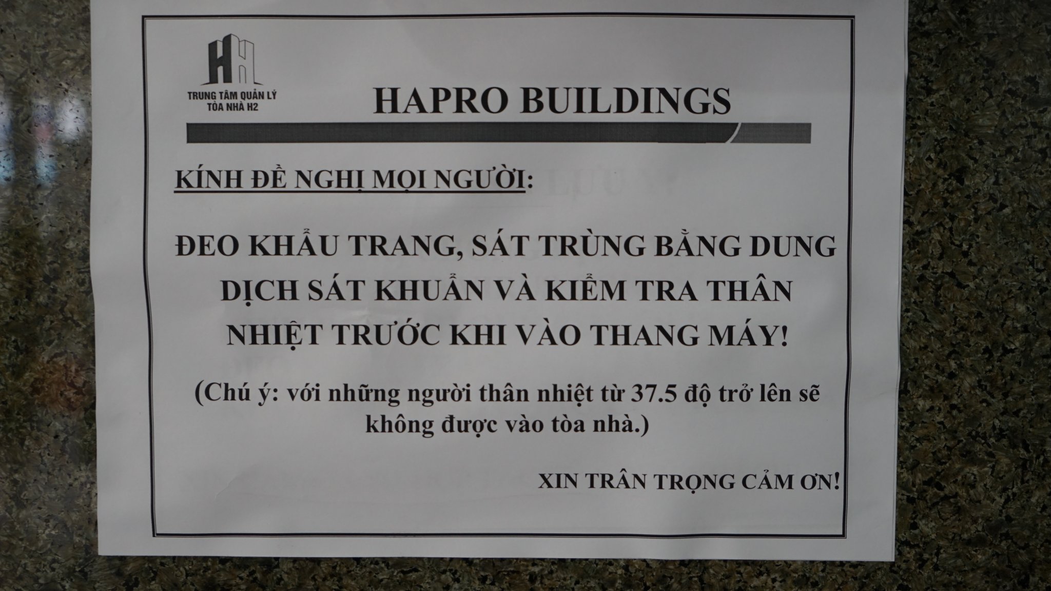 Từ tầng hầm, cửa chính, cửa phụ, thang máy,...tại tòa nhà Hapro đều gắn dòng chữ thông báo để mọi người trong tòa nhà và những người trước khi vào tòa nhà được biết.