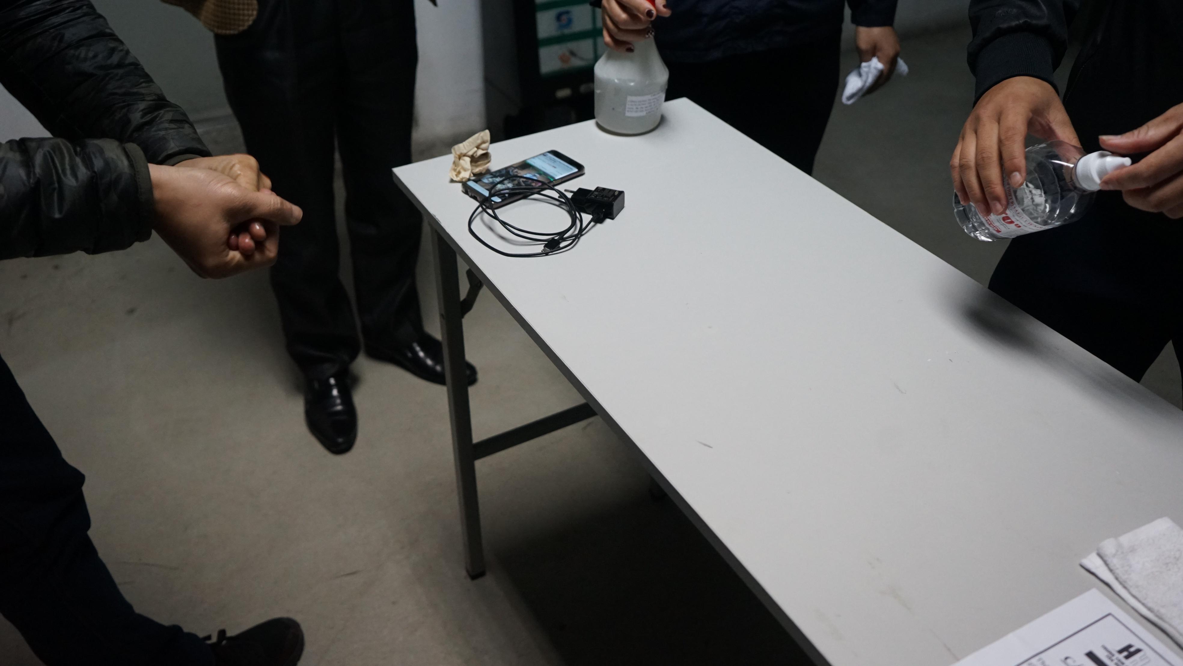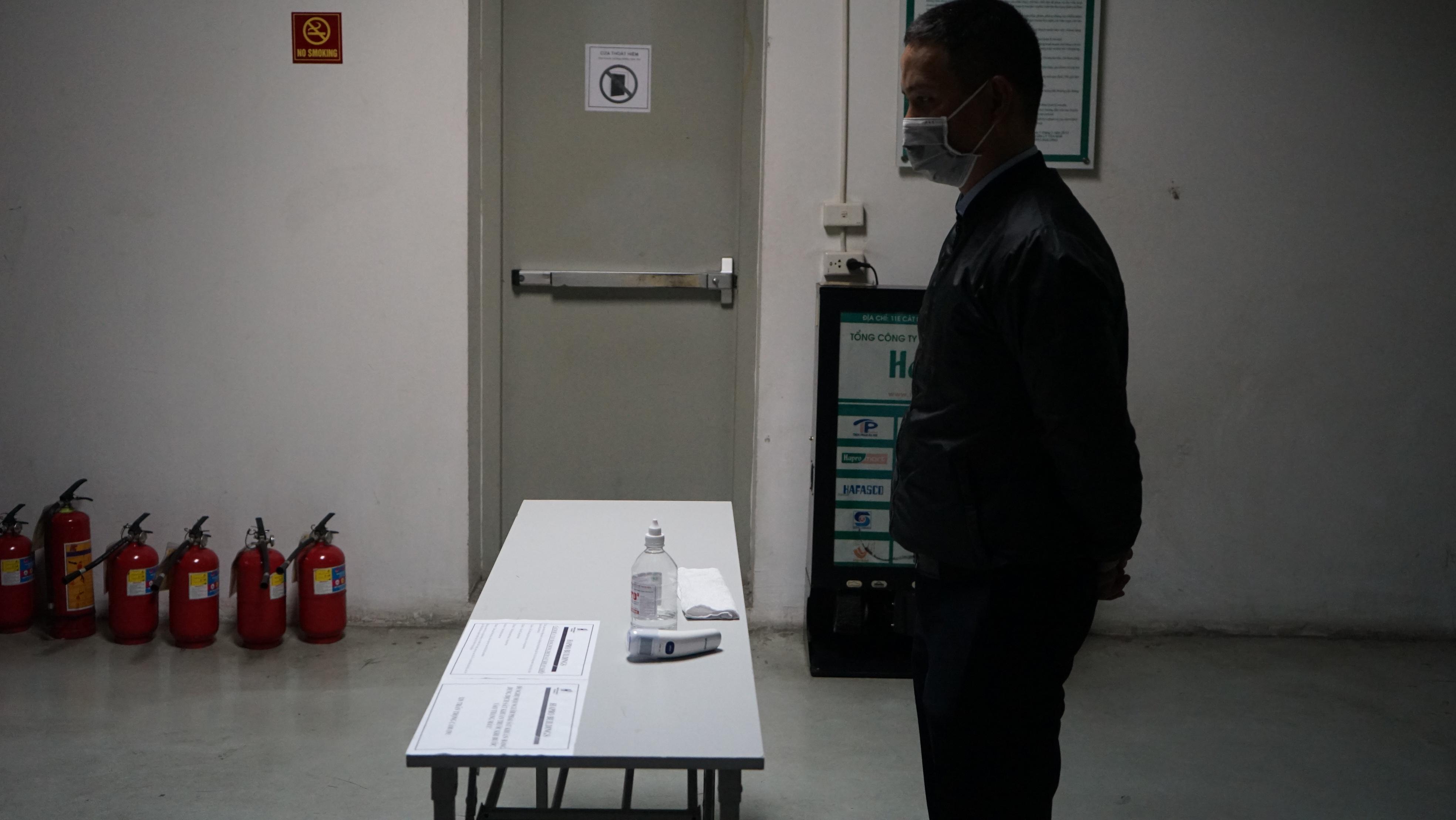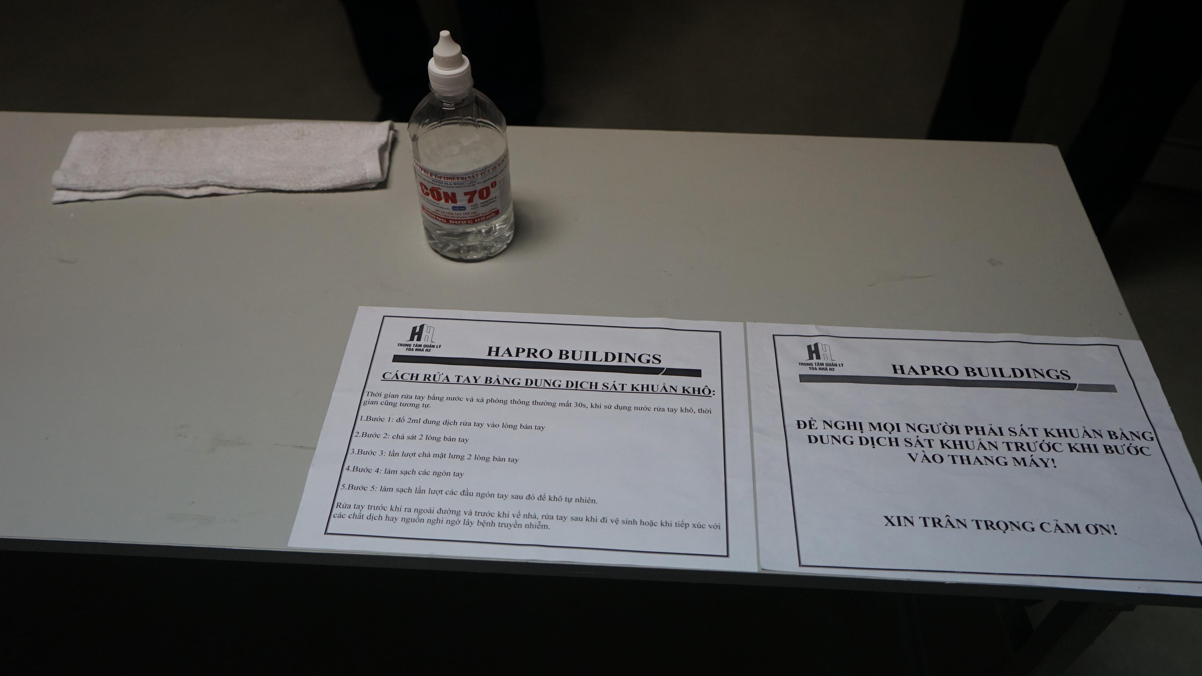 Mọi cá nhân khi bắt đầu gửi xe từ tầng hầm trước khi di chuyển lên các tầng đều được nhân viên tòa nhà yêu cầu rửa tay bằng nước sát khuẩn.