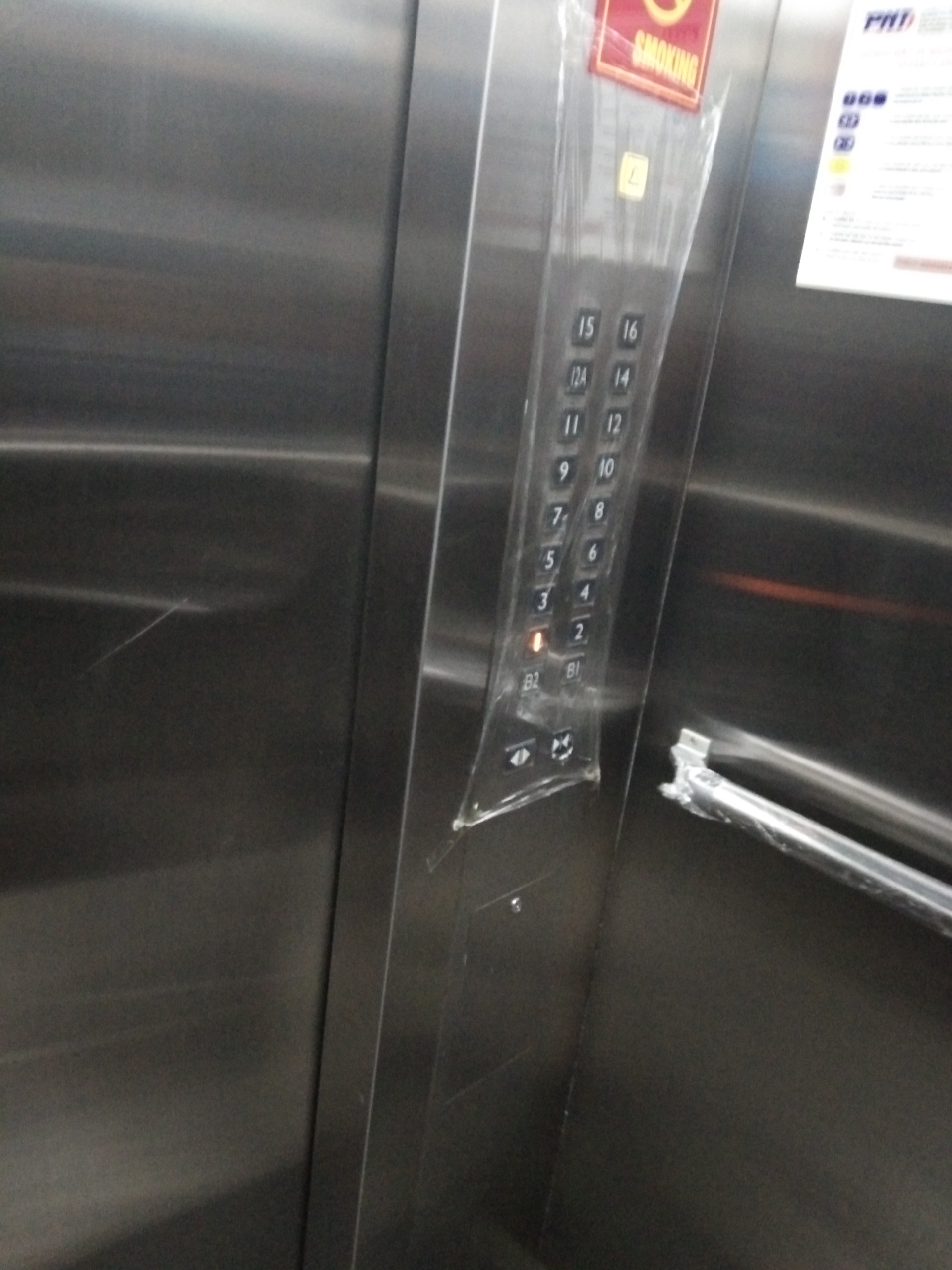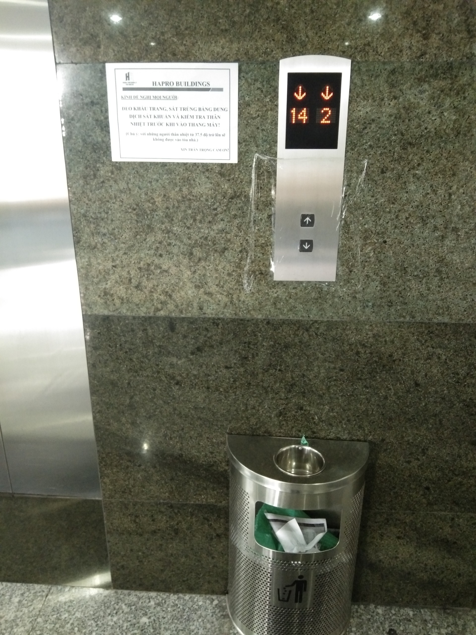 Màng chắn bọc quanh nút bấm thang máy tại tòa nhà Hapro.