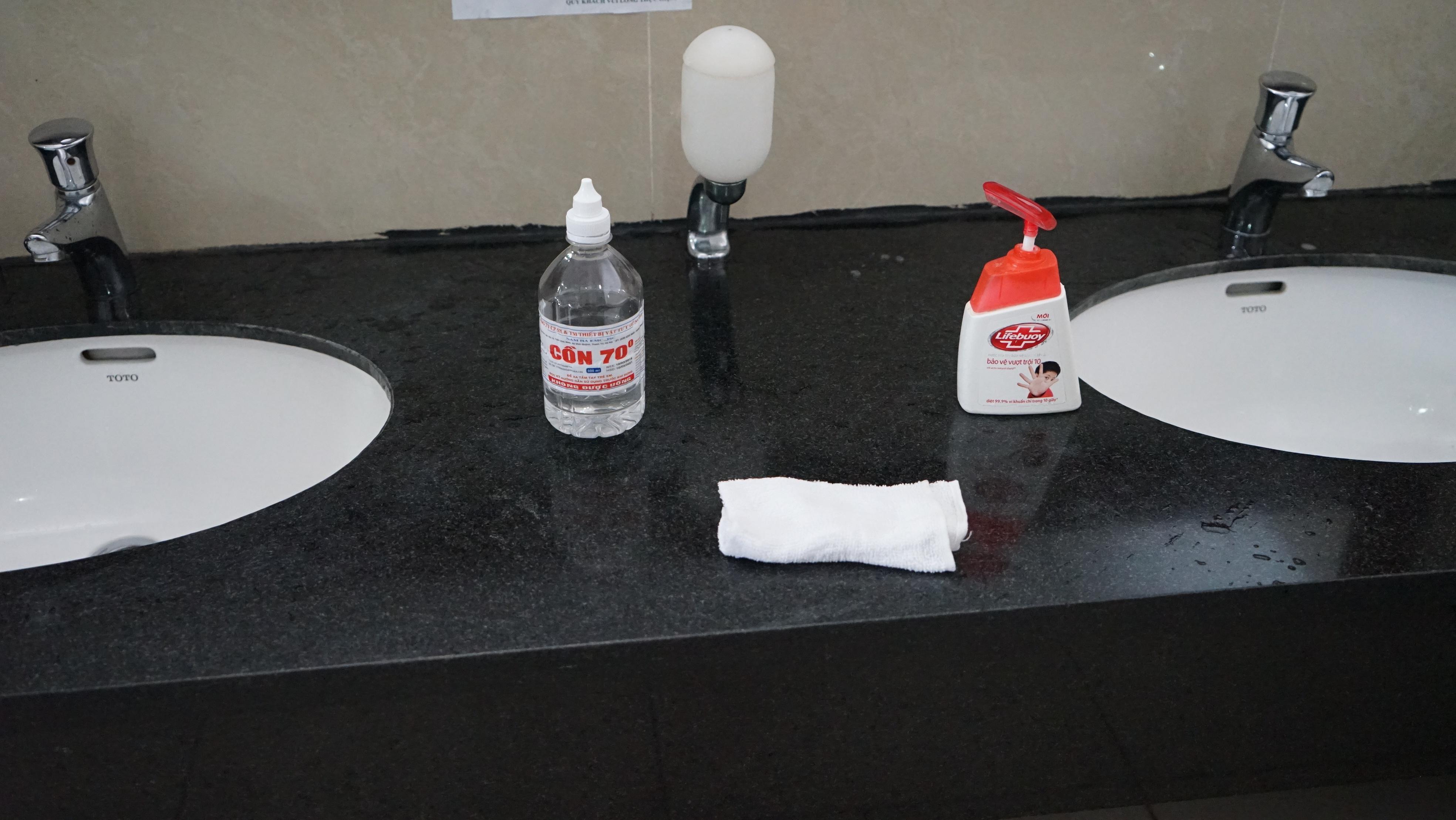 Ngay cả những nhà vệ sinh tại tòa nhà cũng trang bị nước sát khuẩn, xà phòng Lifeboy, khăn sạch, máy sấy,...để mọi người sát trùng.