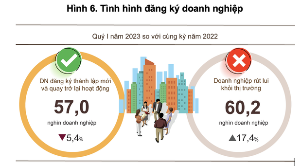 Tính chung quý I năm 2023, số doanh nghiệp tạm ngừng kinh doanh có thời hạn là 42.900 doanh nghiệp, tăng 20,1% so với cùng kỳ năm trước; gần 12.800 doanh nghiệp ngừng hoạt động chờ làm thủ tục giải thể, tăng 13,1%; 4.600 doanh nghiệp hoàn tất thủ tục giải thể, tăng 6,5%. Bình quân một tháng có gần 20.100 nghìn doanh nghiệp rút lui khỏi thị trường.