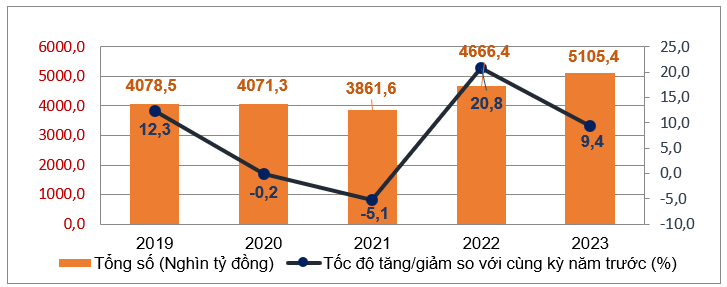 Tính chung 10 tháng năm 2023, tổng mức bán lẻ hàng hóa và doanh thu dịch vụ tiêu dùng theo giá hiện hành ước đạt 5.105,4 nghìn tỷ đồng, tăng 9,4% so với cùng kỳ năm trước (cùng kỳ năm 2022 tăng 20,8%), nếu loại trừ yếu tố giá tăng 6,9% (cùng kỳ năm 2022 tăng 16,7%).