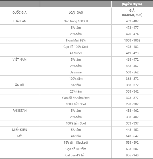 Giá gạo xuất khẩu của một số nước ngày 20/5. Nguồn: Oryza.