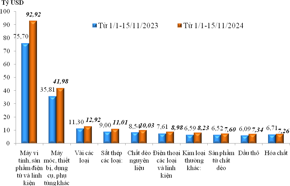 Trong đó một số nhóm hàng tăng mạnh như: máy vi tính, sản phẩm điện tử & linh kiện tăng 17,21 tỷ USD, tương ứng tăng 22,7%; máy móc thiết bị dụng cụ và phụ tùng tăng 6,17 tỷ USD, tương ứng tăng 17,2%; sắt thép các loại tăng 2,01 tỷ USD, tương ứng tăng 22,4%; kim lọai thường khác tăng 1,64 tỷ USD, tương ứng tăng 1,64 tỷ USD; điện thoại các loại và linh kiện tăng 1,37 tỷ USD, tương ứng tăng 18%... so với cùng kỳ năm 2023.