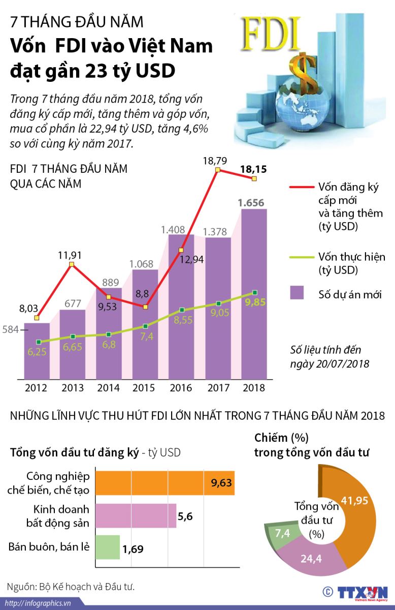 Nếu tính cả vốn đăng ký bổ sung của các dự án đã cấp phép từ các năm trước thì vốn đầu tư trực tiếp nước ngoài vào ngành công nghiệp chế biến, chế tạo trong 7 tháng đạt 9,07 tỷ USD, chiếm 77,6% tổng vốn đăng ký; ngành hoạt động kinh doanh bất động sản đạt 716 triệu USD, chiếm 6,1%; các ngành còn lại đạt 1,9 tỷ USD, chiếm 16,3%.