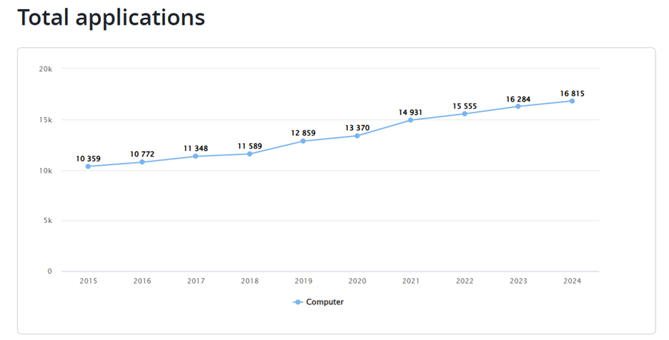Trong năm 2024, số lượng đơn xin cấp bằng sáng chế của EU dành cho công nghệ máy tính đã tăng 3,3%, đạt mức 16.815 đơn. Điều này cho thấy sự bùng nổ của các sáng chế liên quan đến phần mềm, thuật toán, trí tuệ nhân tạo, điện toán đám mây, an ninh mạng và điện toán lượng tử.