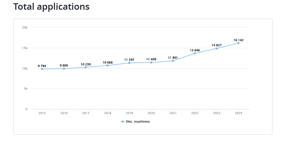 Điều này có thể được lý giải bởi sự gia tăng của các công nghệ liên quan đến công nghệ pin, tự động hóa, sản xuất thông minh, robot công nghiệp và năng lượng tái tạo. Sự chuyển đổi sang năng lượng sạch và bền vững, cùng với nhu cầu cải tiến hiệu suất thiết bị điện, đã thúc đẩy mạnh mẽ sự đổi mới trong ngành này.