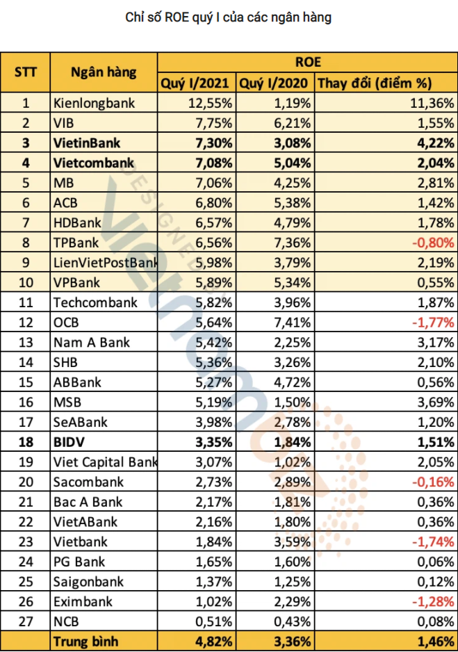 Theo thống kê từ báo cáo tài chính hợp nhất của 27 ngân hàng đã công bố quý I/2021, cùng với sự tăng trưởng mạnh về lợi nhuận, chỉ số lợi nhuận trên vốn chủ sở hữu (ROE) của phần lớn ngân hàng đều tăng so với cùng kỳ năm trước. Chỉ có 5/27 ngân hàng ghi nhận ROE giảm.