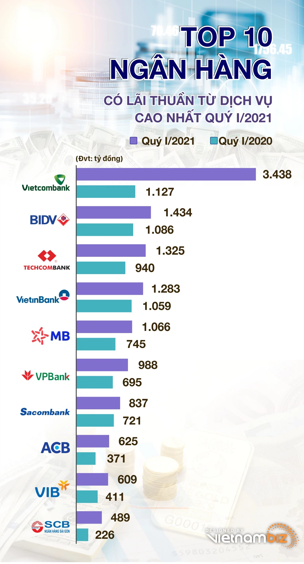 Top 10 ngân hàng thu lãi cao nhất từ mảng dịch vụ gồm: Vietcombank, BIDV, Techcombank, VietinBank, MB, VPBank, Saocombank, ACB, VIB và SCB. Top 5 ngân hàng dẫn đầu có lãi thuần từ dịch vụ trên 1.000 tỷ đồng trong quý I.