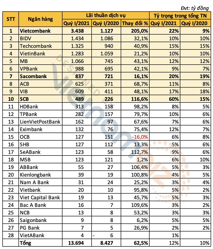 Xét về tỷ trọng trong tổng thu nhập, SCB, Vietcombank và Sacombank là ba ngân hàng có tỷ trọng thu lãi từ dịch vụ cao nhất.