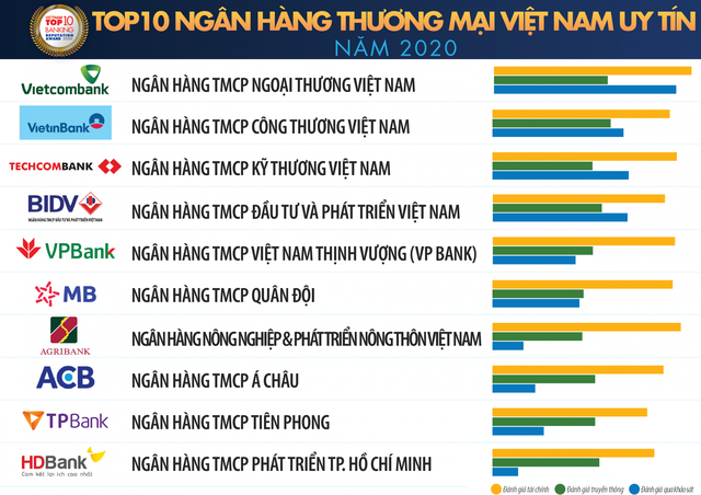 Top 10 ngân hàng có được gọi tên năm nay bao gồm Vietcombank, VietinBank, Techcombank, BIDV, VPBank, MB, Agribank, ACB, TPBank và HDBank.