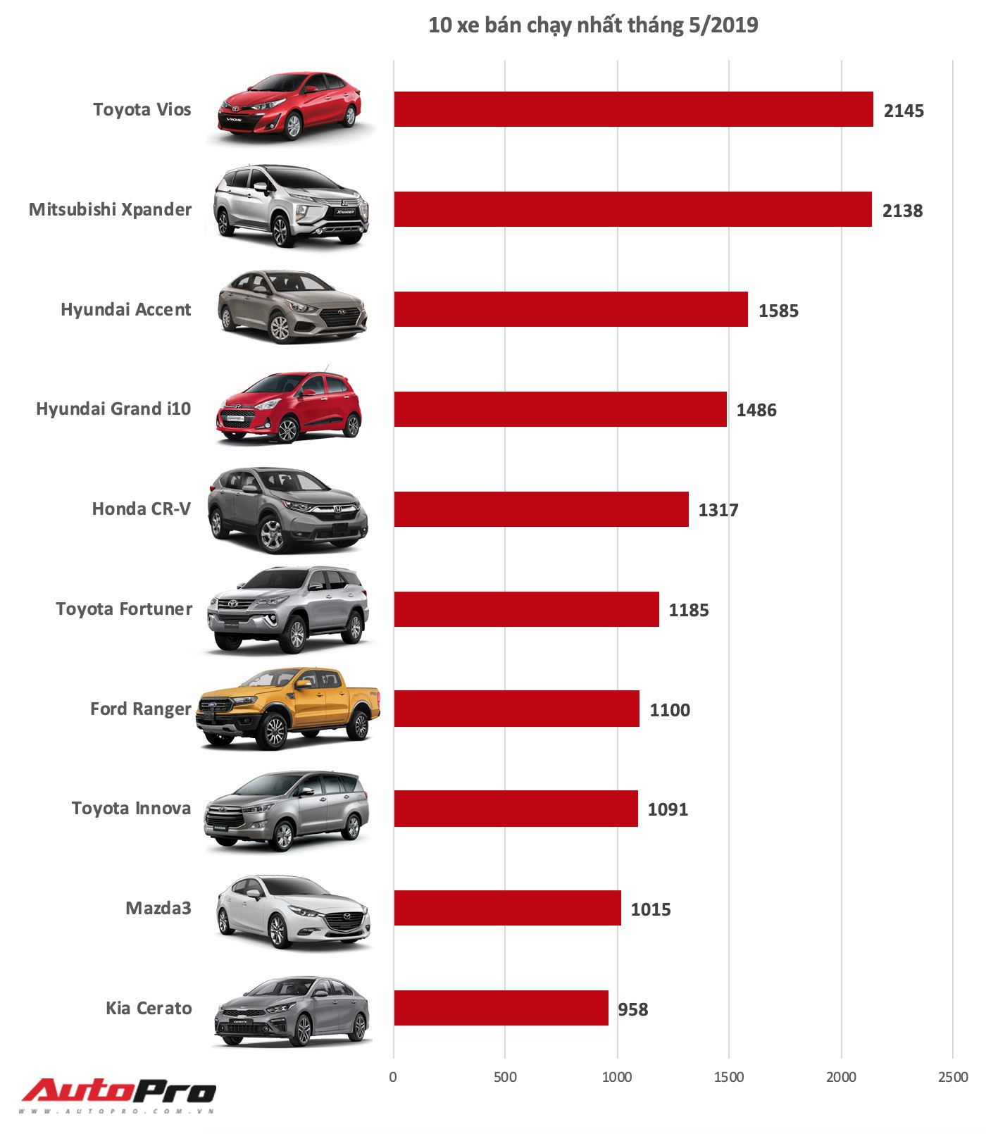 Dưới đây là Top 10 ô tô bán chạy nhất tháng 5: