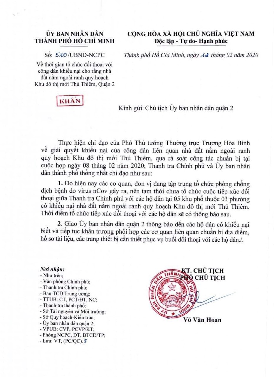 Ngày 12/2/2020, UBND TP. HCM đã có công văn khẩn về việc tạm thời chưa tổ chức cuộc tiếp xúc đối thoại với người dân liên quan đến nhà đất tại Thủ Thiêm do các cơ quan chức năng đang lo phòng chống dịch bệnh virus Corona (nCoV).