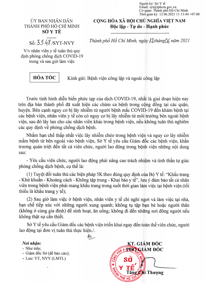 Ngày 12/6, Phó giám đốc Sở Y tế TP HCM Tăng Chí Thượng ra công văn hỏa tốc yêu cầu nhân viên y tế tuân thủ quy định phòng chống dịch Covid-19 trong và sau giờ làm việc.