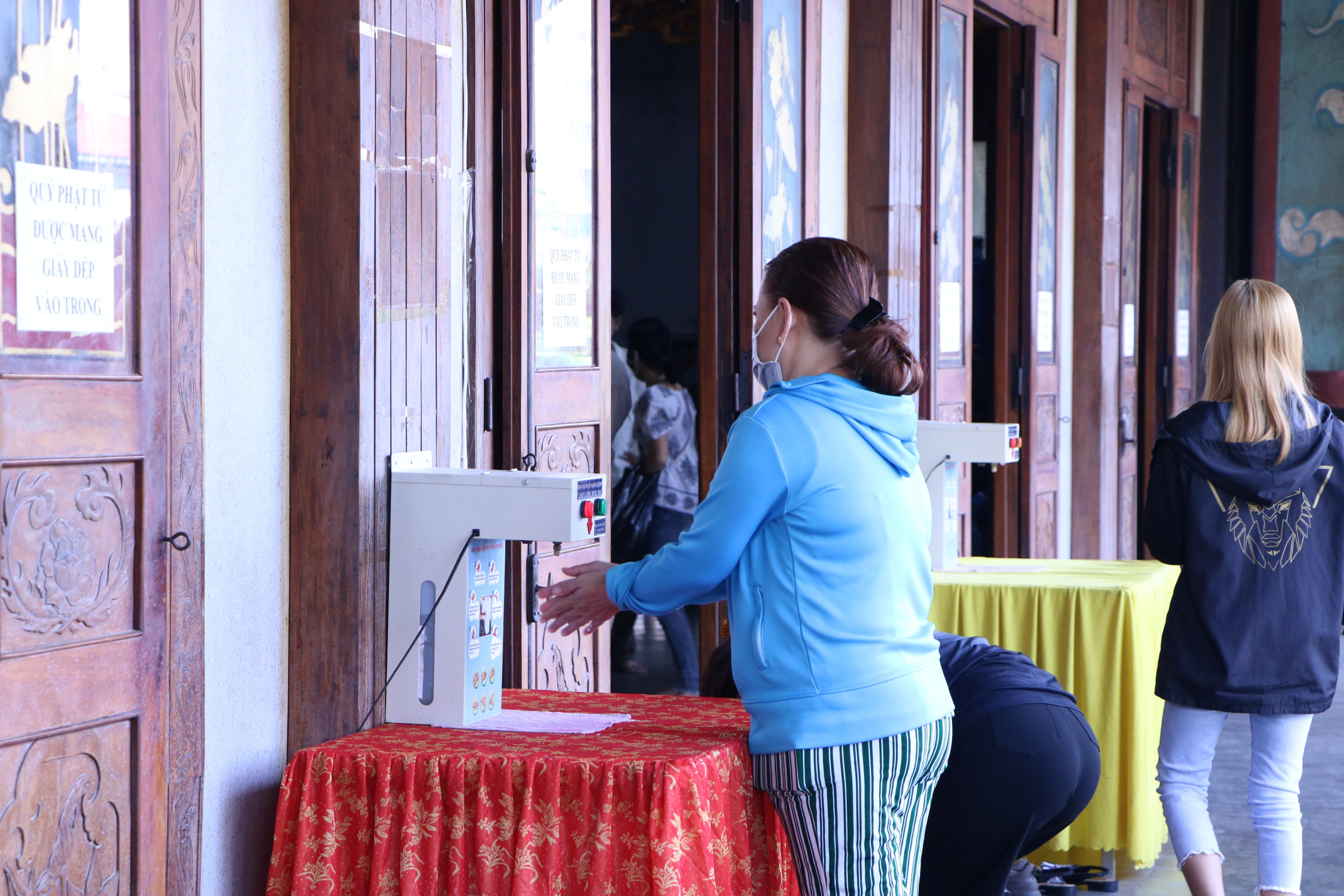 Chùa Việt Nam Quốc Tự, quận 10 đặt máy rửa tay sát khuẩn cho khách đảm bảo phòng chóng dịch Covid – 19.
