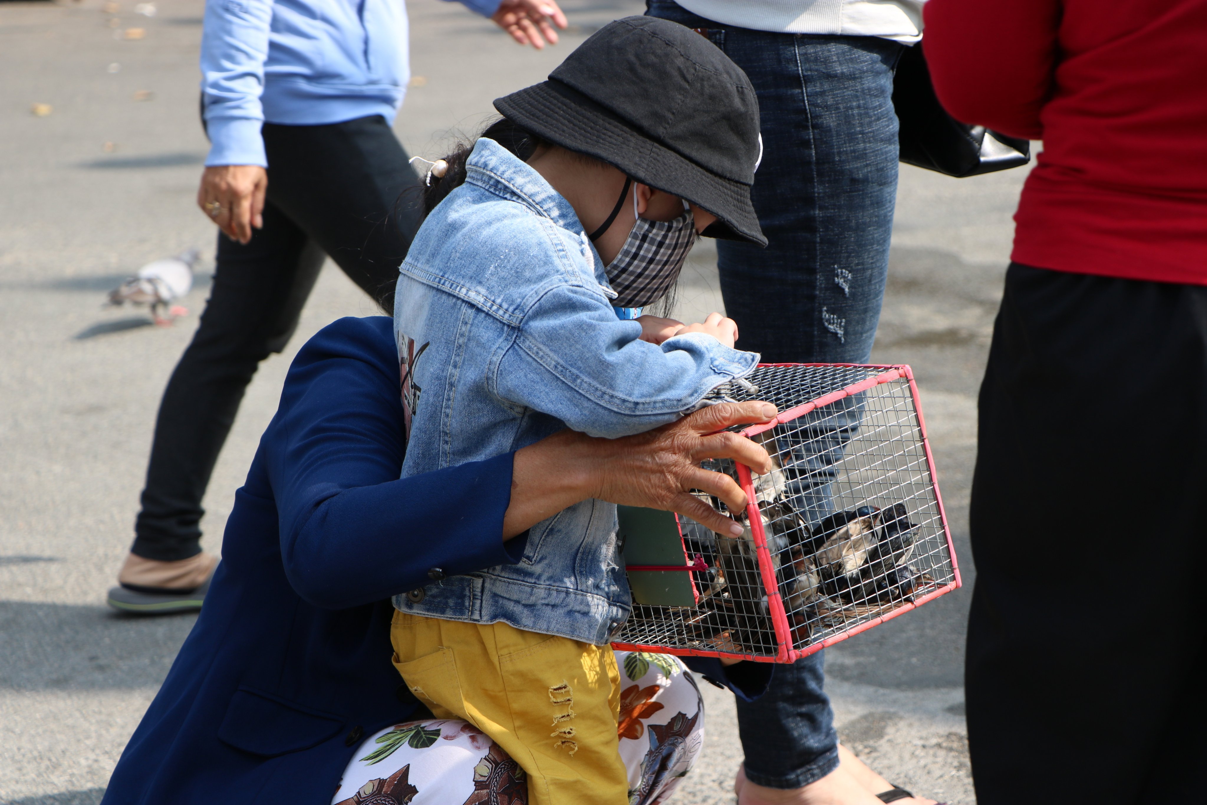 Người già và trẻ nhỏ đang thực hiện phóng sanh cũng không quên mang khẩu trang.