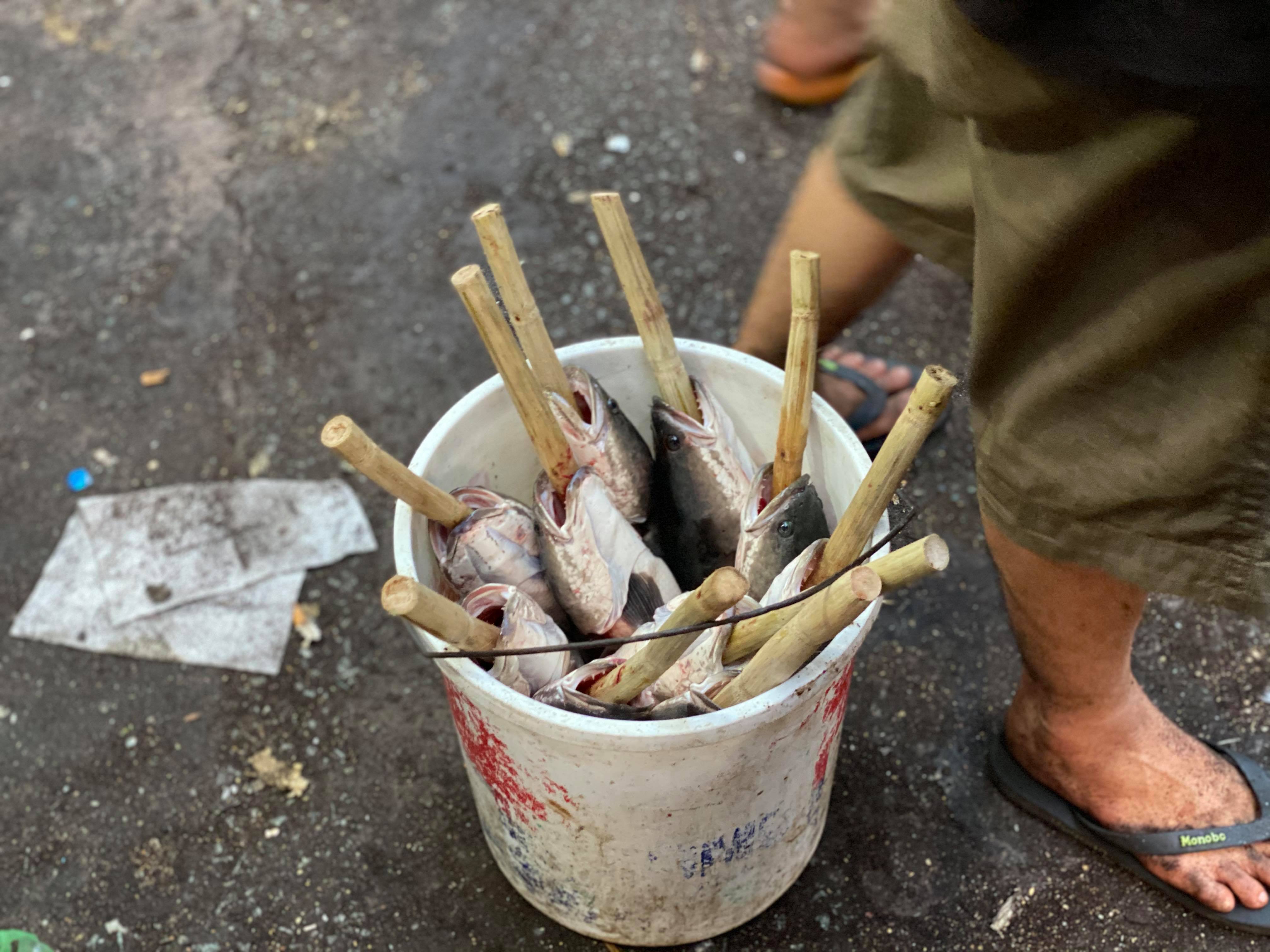 Người dân xếp hàng đợi mua cá lóc nướng cúng cầu may đầu năm.