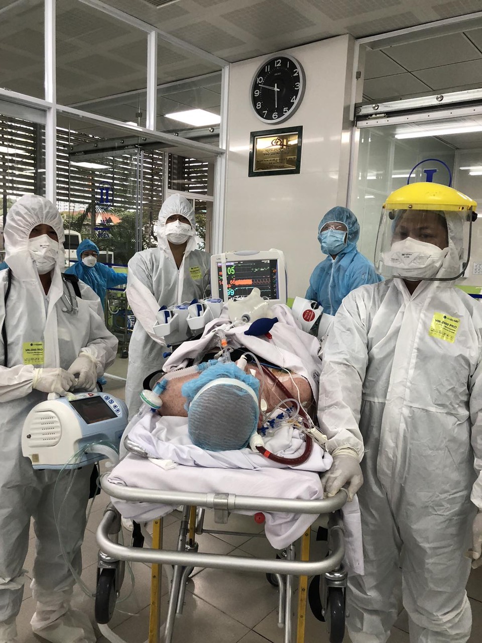 Ngoài ra, trong quá trình điều trị có nhiều đợt cả ekip phải thót tim với bệnh nhân, bởi vì “thấy chết như không”, thấy trước mắt chết trên giường bệnh, bàn mổ. Nhưng đầu tiên phải đặt lỗ khí quản cho bệnh nhân này thoải mái, sau đó viêm phổi xấu, suy tạng, như vậy phải chạy ESMO, vừa thở máy vừa lọc máu, chạy thận nhân tạo, như vậy trên người bệnh nhân toàn dây. Trường hợp bệnh nhân Covid xảy ra vừa đông máu vừa chảy máu khiến cho việc điều trị khó khăn hơn. Lần thót tim thứ hai khi bệnh nhân đang chạy ESMO, đang thở máy bất ngờ tràn khí màn phổi như vậy mình phải dẫn lưu màn phổi và phải truyền thêm dây vào người bệnh nhân. Lần ba đưa bệnh nhân đi chụp CT.