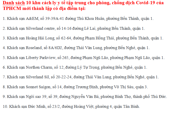 Trong đó có 7 khách sạn ở quận 1, 3 khách sạn tại quận 3, TP Thủ Đức và quận Tân Bình. Giám đốc Sở Y tế TP phối hợp với chính quyền các quận, huyện và thành phố Thủ Đức tổ chức phân luồng tại cửa khẩu, sân bay, vận chuyển người có nhu cầu cách ly trả phí về những khu cách ly này.