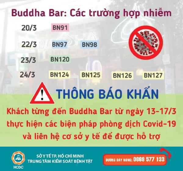 Theo thông báo khẩn phát đi chiều 26/3, Trung tâm Kiểm soát bệnh tật thành phố Hồ Chí Minh (HCDC) cho biết, thành phố đã xác định quán bar Buddha (số 7 đường Thảo Điền, phường Thảo Điền, quận 2) là nơi phát sinh chuỗi lây truyền bệnh vì đã phát hiện 8 trường hợp nhiễm Covid -19 và tiếp tục phát hiện thêm các trường hợp có nguy cơ nhiễm bệnh cao.