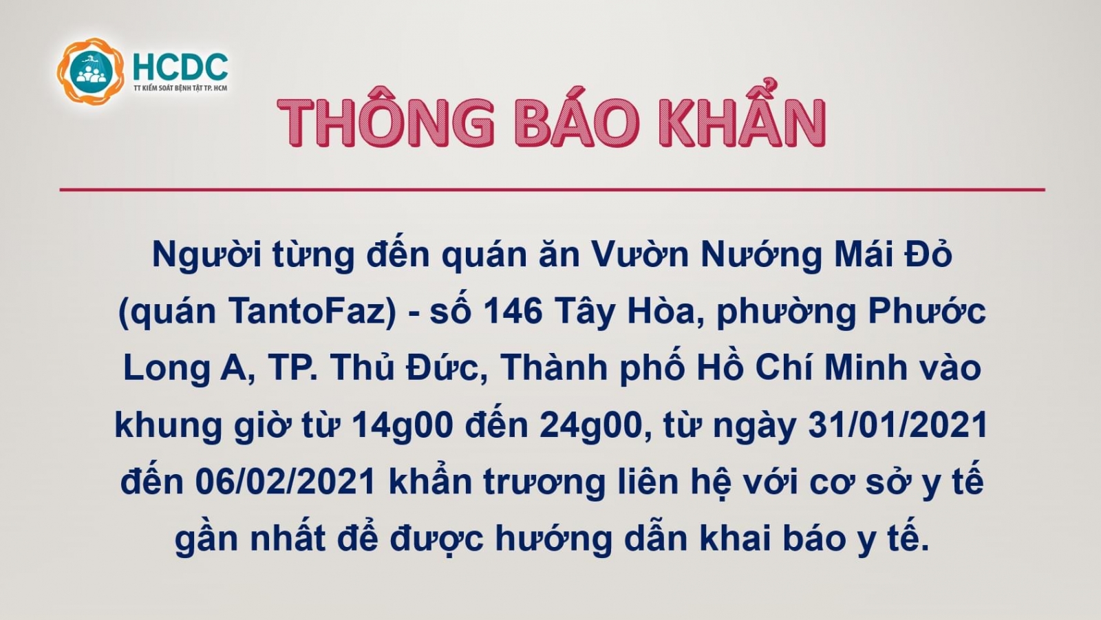 Trước đó, tối 10/2, HCDC cũng phát đi 2 thông báo tìm người đến các địa điểm gồm Trung tâm tiệc cưới The Adora và quán ăn Vườn Nướng Mai Đỏ cần liên hệ gấp cơ sở y tế.