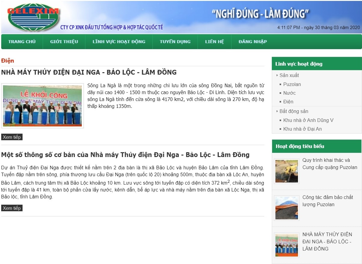 "Bước đầu có thể xác định được GELEXIM đã chiếm dụng một phần vốn đầu tư xây dựng hệ thống hạ tầng kỹ thuật và trốn tránh trách nhiệm trong việc đầu tư tại dự án Khu nhà ở Đại An" (ảnh chụp màn hình website Công ty GELEXIM)