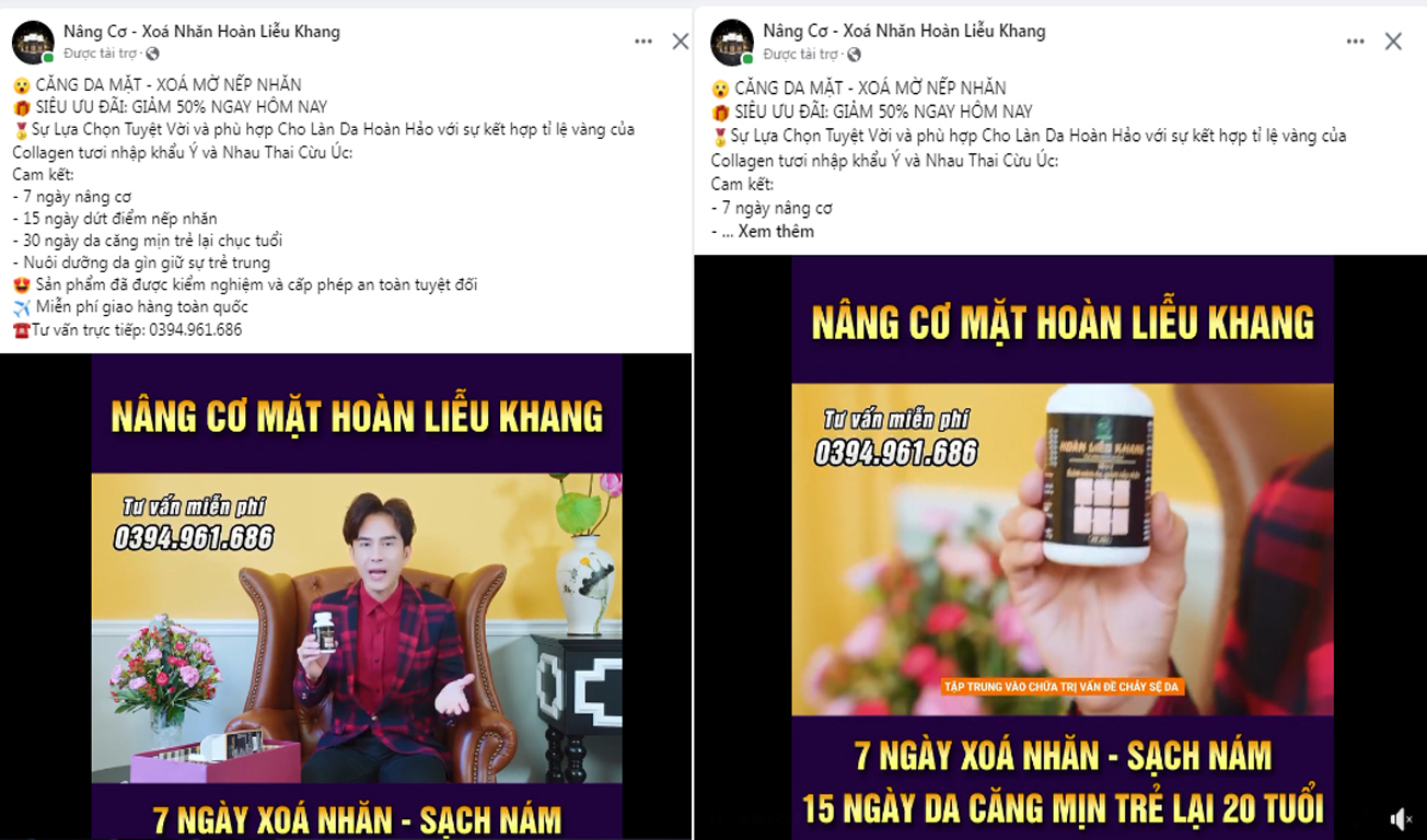 Cụ thể, tại fanpage có tên Nâng cơ – Xoá nhăn Hoàn Liễu Khang (https://www.facebook.com/trehoadahoanlieukhang2), sản phẩm Hoàn Liễu Khang được giới thiệu là Viên uống nâng cơ mặt Hoàn Liễu Khang, với dòng cam kết “7 ngày nâng cơ mặt, 14 ngày xoá nếp nhăn da căng mịn”. Trên fanpage này có rất nhiều bài đăng giới thiệu về công dụng cũng như các tinh chất của sản phẩm, chẳng hạn như bài đăng có tựa đề “Nâng cơ mặt, xoá nếp nhăn”, nội dung bài viết này khẳng định “với sự kết hợp tỉ lệ vàng của Collagen tươi nhập khẩu Ý và Nhau thai cừu Úc”, sử dụng ‘1 viên mỗi ngày trẻ ra 20 tuổi’. Đi kèm với đó là lời cam kết “7 ngày nâng cơ; 15 ngày dứt điểm nếp nhăn; 30 ngày da căng mịn trẻ lại chục tuổi; Nuôi dưỡng da gìn giữ sự trẻ trung”.