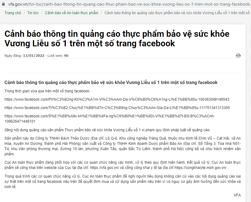 Theo Cục An toàn thực phẩm, trong thời gian vừa qua trên một số trang facebook đăng nội dung quảng cáo sản phẩm Thực phẩm bảo vệ sức khỏe (TPBVSK) Vương Liễu số 1 vi phạm quy định pháp luật về quảng cáo.