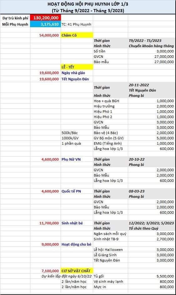 Có bốn hạng mục cần chi 15 triệu đồng/mục là gửi giáo viên chủ nhiệm hoạt động học kỳ I, gửi giáo viên chủ nhiệm hoạt động học kỳ II, quà học kỳ I và quà học kỳ II; Mục hoa + quà 20/11 và Tết âm lịch cho các bộ phận chi 13 triệu đồng/mục.