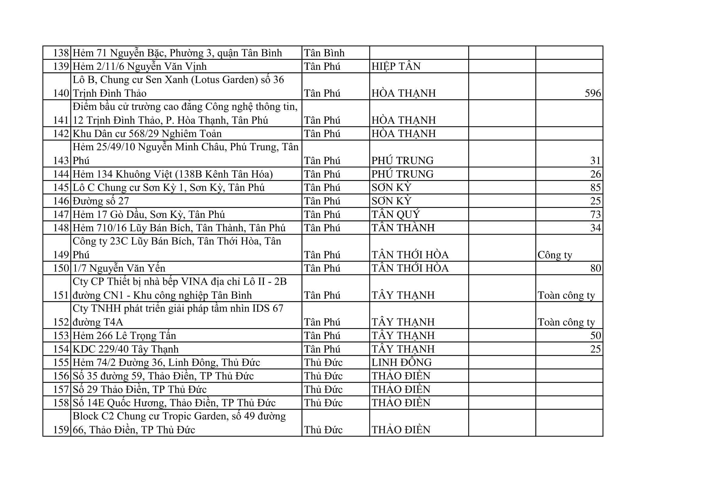 Trung tâm Kiểm soát bệnh tật TPHCM (HCDC) đã cập nhật danh sách các địa điểm còn phong toả tại TPHCM cho người dân biết để có biện pháp phù hợp khi có nhu cầu đi lại, giao dịch... Cụ thể như sau: