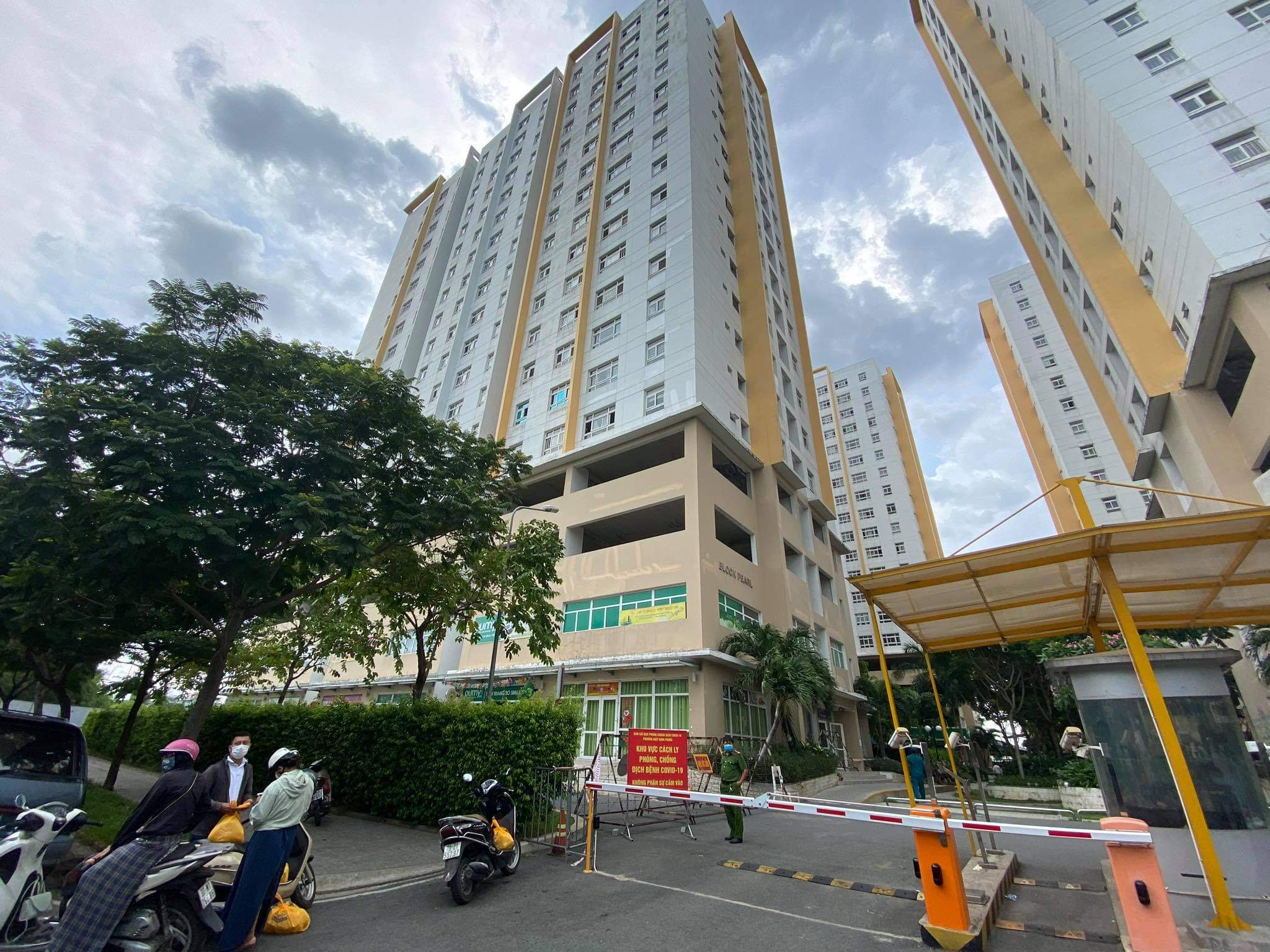 Sau khi tiếp nhận thông tin, hàng chục cảnh sát, dân phòng, bảo vệ dựng rào chắn, gắn biển cảnh báo khu vực cách ly trước chung cư Sunwiew Town, phường Hiệp Bình Phước, TP Thủ Đức, TP.HCM.