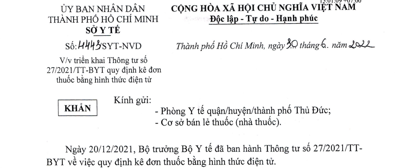 Công văn khẩn của Sở Y tế TP.HCM về việc triển khai kê đơn thuốc bằng hình thức điện tử