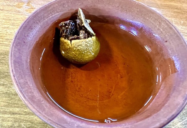Cầm trên tay trái trà quýt cổ, vỏ màu nâu nhạt của trái khô tự nhiên điểm đốm trắng như tuyết sương, màu trà trong trái quýt ngả vàng đỏ sang đỏ sậm do quá trình lên men tối ưu và để trà theo thời gian, có thể thấy ngay hương vị của núi rừng.