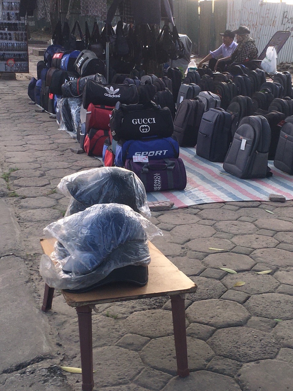 Dọc theo đường Tố Hữu (quận Hà Đông), không khó để bắt gặp những “cửa hàng di động”, tại đây được bày bán đủ loại mặt hàng như túi xách, giày dép, quần áo, mũ lưỡi chai, mũ bảo hiểm… Để mục sở thị, chúng tôi ghé một sạp hàng chuyên bày bán ba lô, túi du lịch và ví cầm tay…Tại đây, các loại túi đều mang thương hiệu nổi tiếng như Gucci, Louis Vuitton, Nike, Adidas… Giá cho mỗi sản phẩm chỉ vài chục nghìn đồng, đắt nhất cũng chỉ 100 nghìn đồng.