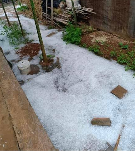 Viên mưa đá to bằng đầu ngón tay người, rơi xuống liên tục vào mái nhà, thềm nhà và vườn hoa màu của người dân, gây hư hại.