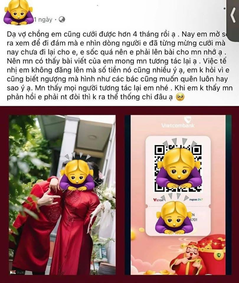 Liên quan đến sự việc, mới đây cô gái tên T.H - chủ nhận của bài đăng cũng có chia sẻ gây chú ý. Cô cho biết đám cưới của mình được tổ chức từ tháng 7/2025 nhưng mới đây, vì lý do riêng cô mới đăng bài đòi tiền mừng cưới lên trang cá nhân.