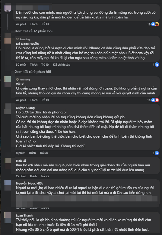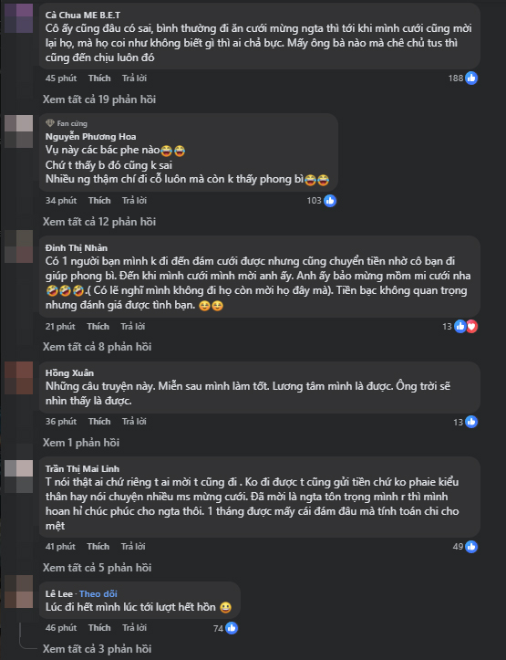 “Gần đây, tôi mở sổ ra xem thì thấy nhiều người không đến dự, cũng không gửi tiền mừng cưới mình. Trong khi trước đó, tôi đều mừng họ 500.000 đồng đến 1 triệu đồng. Tôi nhận ra, mình nhiệt tình với họ nhưng họ không tôn trọng mình nên mới đăng bài như vậy”, T.H. chia sẻ.
