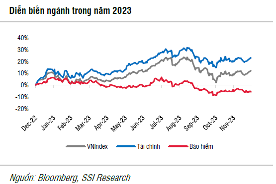 Trong năm 2023, Ngành Bảo hiểm có diễn biến kém khả quan so với chỉ số VNIndex do điều kiện vĩ mô và lãi suất giảm mạnh.