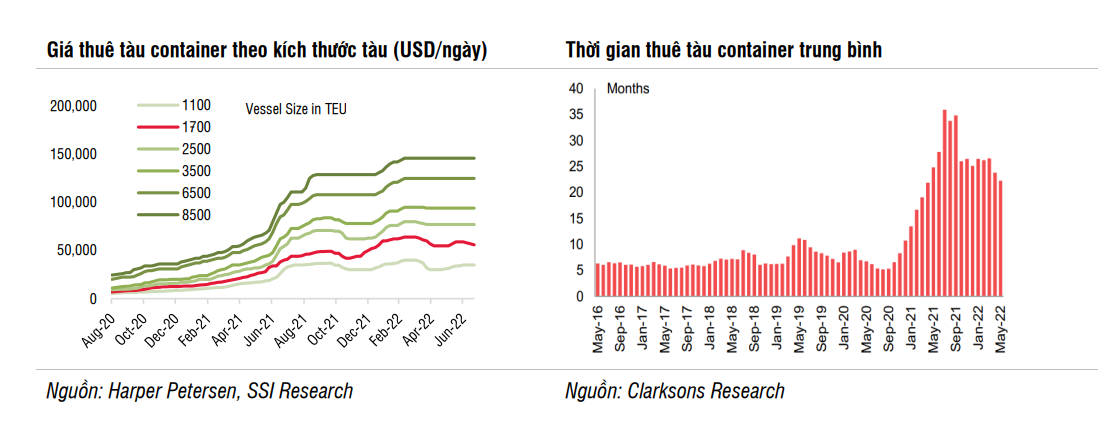 Tuy nhiên, SSI cho rằng yếu tố chính quyết định quá trình điều chỉnh giá cước là: vấn đề tắc nghẽn chuỗi cung ứng. Hiện tại, chưa nhận thấy dấu hiện tình trạng tắc nghẽn cảng sẽ cải thiện. Giá cước sẽ cần một thời gian dài để điều chỉnh từ mức đỉnh, giá cước giảm dần nhưng vẫn ở mức cao trong nửa cuối 2022. Mặc dù vậy, giá cước có thể giảm mạnh vào năm 2023 nếu tình trạng tắc nghẽn được giải quyết và Trung Quốc mở cửa trở lại. Tuy nhiên, mức giá cân bằng sẽ cao hơn mức trước dịch Covid do các hãng vận chuyển phải chịu chi phí đầu tư và chi phí vận hành cao hơn nhiều so với trước đây.