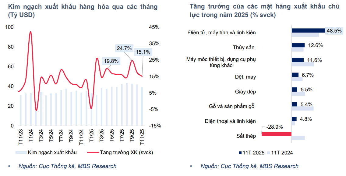 Dữ liệu 11 tháng năm 2025 cho thấy kim ngạch xuất khẩu sang Mỹ tăng mạnh 27,2%, đạt gần 139 tỷ USD, phần nào phản ánh hiệu ứng “frontloading” trước các rủi ro chính sách. Tuy nhiên, MBS lưu ý thị trường Mỹ đang có dấu hiệu chững lại theo tháng, cho thấy tăng trưởng xuất khẩu năm 2026 sẽ mang tính bền vững hơn thay vì bứt tốc ngắn hạn. Ngược lại, xuất khẩu sang Trung Quốc và EU đang phục hồi tích cực, lần lượt tăng 14,5% và 7,9%, góp phần đa dạng hóa thị trường và giảm phụ thuộc vào một khu vực đơn lẻ.