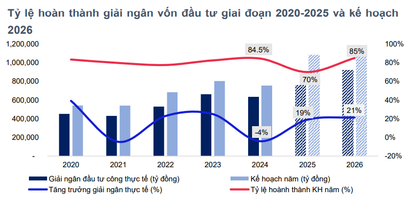 MBS ước tính giải ngân đầu tư công năm 2026 có thể đạt 920–970 nghìn tỷ đồng, tăng 21–28% so với năm 2025 và tương đương 85–90% kế hoạch. Đây là mức giải ngân rất cao, phản ánh quyết tâm của Chính phủ trong việc sử dụng đầu tư công như “đòn bẩy” để kích hoạt tăng trưởng khu vực tư nhân và thu hút FDI.