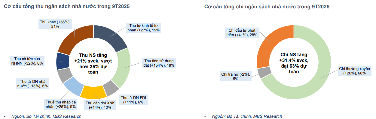 Một trong những điểm nhấn quan trọng trong báo cáo của MBS là dư địa tài khóa đang ở trạng thái thuận lợi hiếm thấy. Tính đến giữa tháng 12/2025, thu ngân sách nhà nước ước đạt 2,47 triệu tỷ đồng, tăng 21% so với cùng kỳ và vượt hơn 25% dự toán. Trong đó, thu từ khu vực kinh tế ngoài quốc doanh và thu tiền sử dụng đất tăng mạnh, phản ánh sự cải thiện trong quản lý và khai thác nguồn thu.