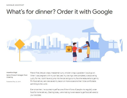 Người dùng có thể sử dụng Google Assistant, Google Search và Google Maps để đặt hàng món ăn từ các nhà hàng thông qua các dịch vụ như DoorDash, Postmate, Delivery.com, Slice và ChowNow, với Zuppler và các dịch vụ khác sắp ra mắt.